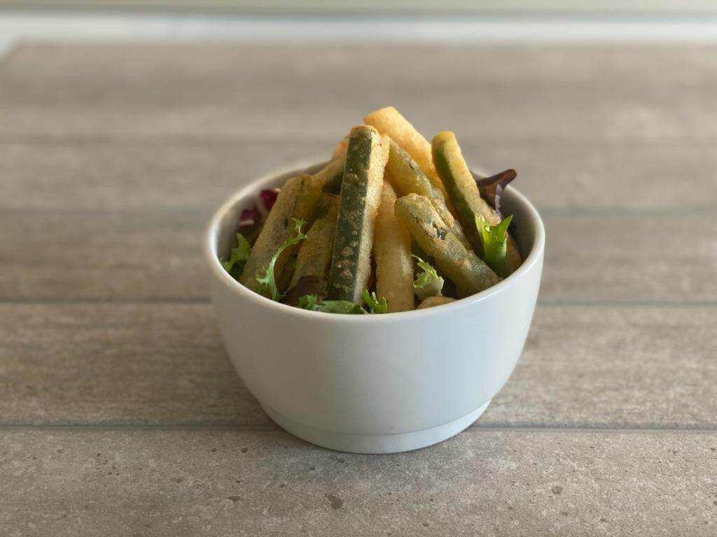 Light, golden tempura batter around tender courgette fries—crisp, delicate, and seriously moreish.